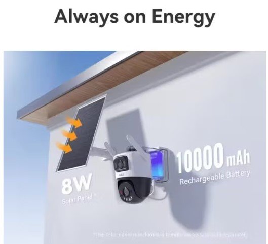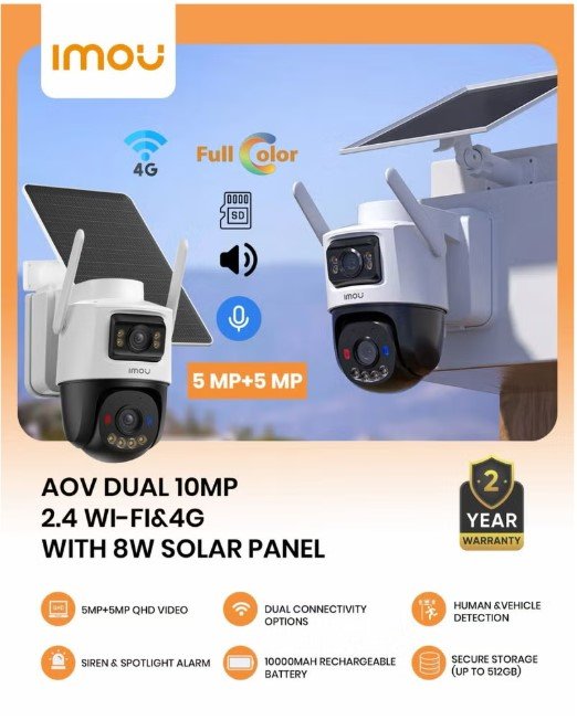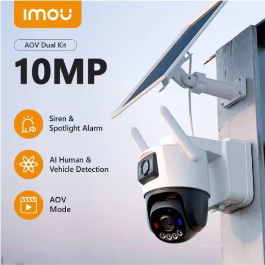 The Imou AOV Dual Outdoor Security Camera is a cutting-edge, wire-free surveillance solution designed for comprehensive home and business protection. Featuring a dual-lens system with two 5MP cameras, it captures both wide-angle and pan/tilt views simultaneously, ensuring no detail is missed. Equipped with 4G LTE and 2.4GHz Wi-Fi connectivity, it provides reliable remote monitoring even in areas with unstable internet, while the 10000mAh rechargeable battery and optional solar panel enable true wire-free operation. The camera’s Always-On Video (AOV) mode continuously records images and switches to full video on motion detection, combined with AI-powered human and vehicle detection to reduce false alerts. It offers 8× digital zoom, full-color night vision, two-way audio communication, and an active deterrence system with siren and spotlight to protect your property in real time. With support for microSD storage up to 512GB and a weatherproof, durable design, the Imou AOV Dual delivers reliable, high-quality security monitoring for any outdoor environment, providing peace of mind 24/7.